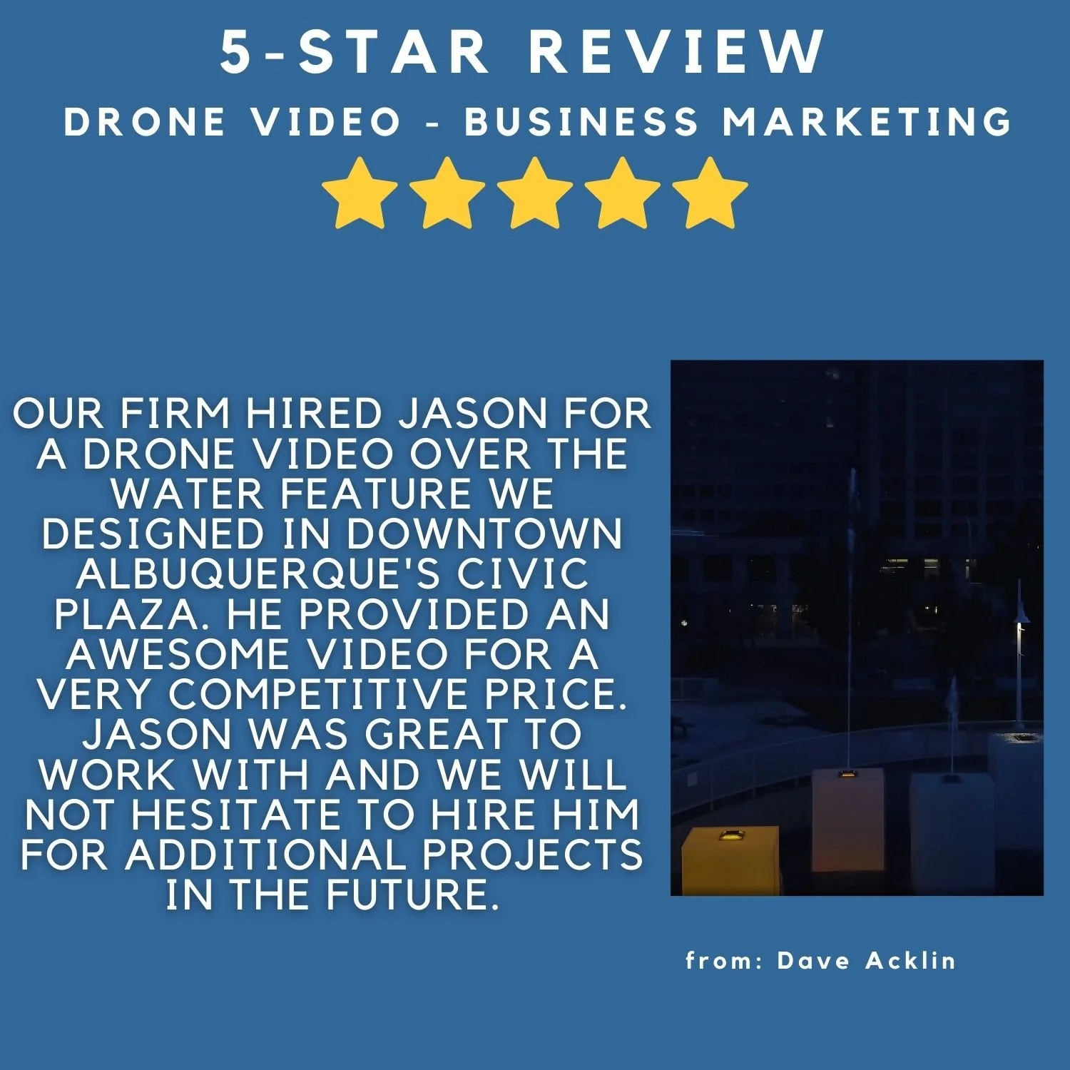 This five-star review reflects the value of professional drone video when documenting design, architecture, and public space projects. In this case, the goal was to capture a water feature in downtown Albuquerque’s Civic Plaza in a way that clearly showed form, scale, and how the design functions within its environment. Thoughtful aerial coverage helped present the project accurately and professionally, without distraction or unnecessary complexity.