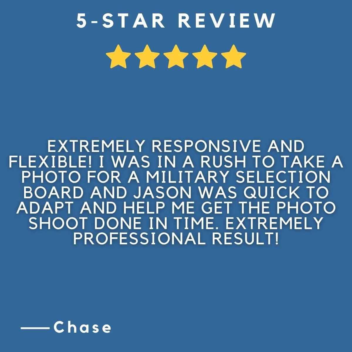 This session came together on a tight timeline, with a specific goal in mind — delivering a professional headshot in time for a military selection board. Being able to adapt quickly while maintaining quality is a key part of how I approach every session, especially when timing matters. I appreciate Chase taking the time to share his experience.